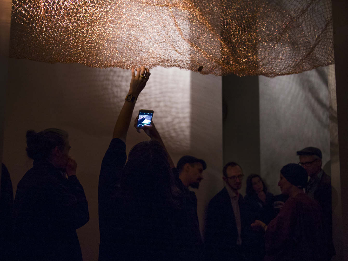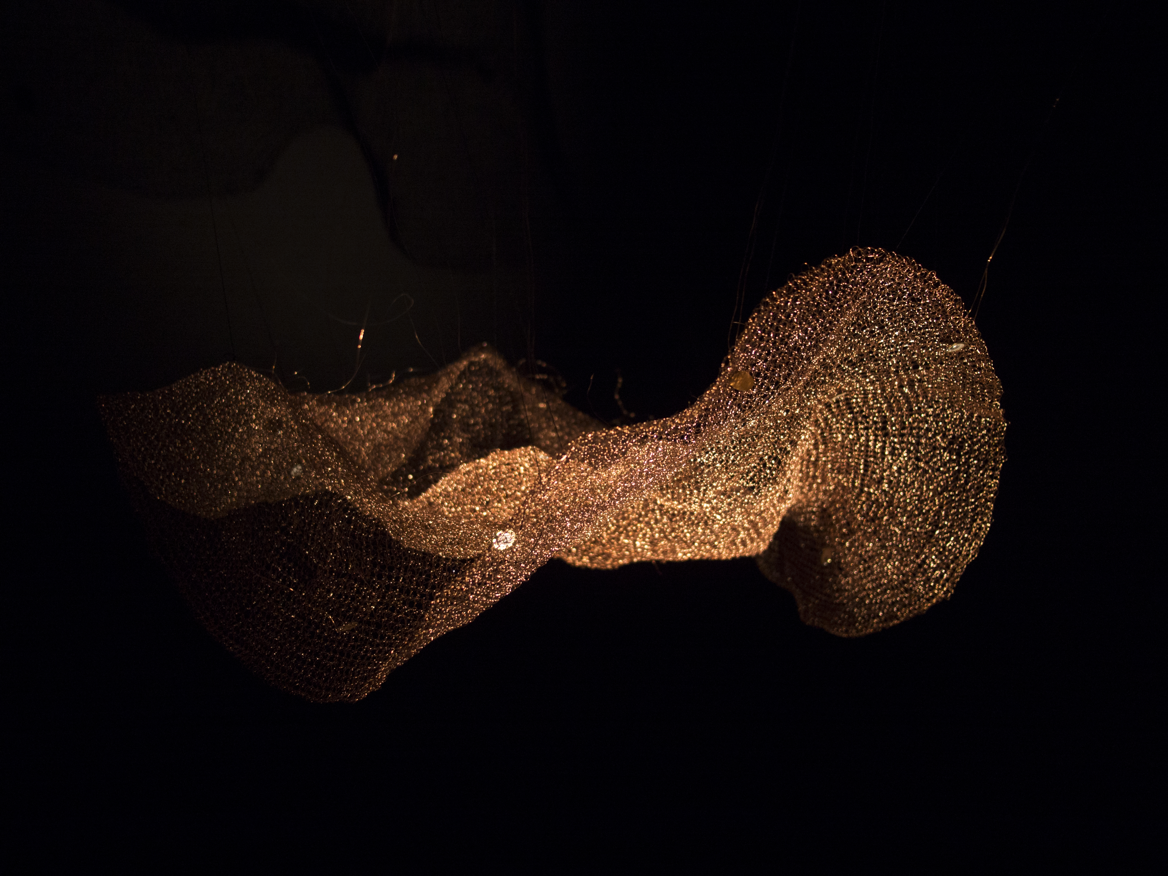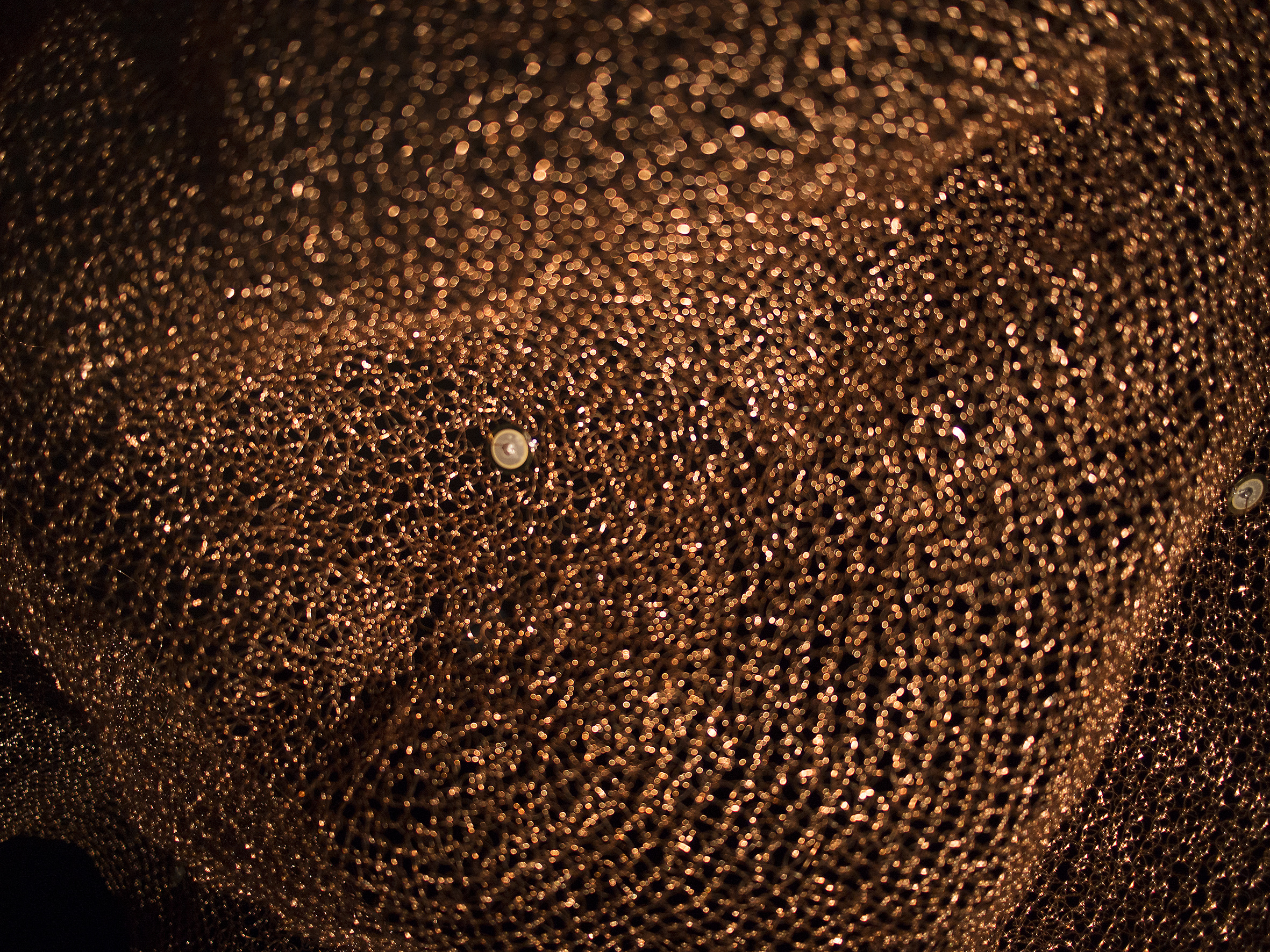 Morphogenesis begins with the creation of a copper structure – a monotonous process of addition to an expanding net of metal. The material is a spiral of cells, layers of rows grow outward, each new cell depending on the previous one for the next to be created. It is crocheted from 5 kilos of copper wire. The wire originates from Bundeswehr stockpiles, where it was used for cable harnesses in airplanes. Once it has reached its full size, it starts working by itself, forming cycles, now in the form of sound waves. Its language is sub-sonic sound, imperceivable to the human ear. Stripped of its audible attributes, in Morphogenesis the sound waves are reduced to their mechanical movement, discernable only to the human eye. The speakers also carry the sound signals picked up by transducers attached to the copper body. Morphogenesis self-monitors its own behavior, seeking order by adjusting its movement accordingly. Morphogenesis can and will be many things at once. It is a single structure consisting of one string organized into a single whole. It is a multiplicity of centres formed from the small independent cells of the structure, intermittantly emphasized by the constantly changing movement of matter.